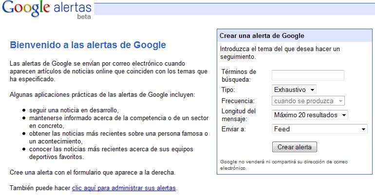 As "Alertas de Google" trátase dun interesante servizo ofrecido por Google que nos permite unha actualización automática sobre a información acerca dunha noticia mediante o noso correo, avisándonos das novidades da mesma. Desta manera, isto permítenos seguir unha noticia en desenrolo, manterse informado acerca da competencia e dun sector concreto, obter noticias máis recentes sobre unha persoa famosa ou acontecemento ou coñecer as noticias máis recentes acerca dos nosos equipos deportivos favoritos, mediante a búsqueda dun termo concreto elexido por nós.